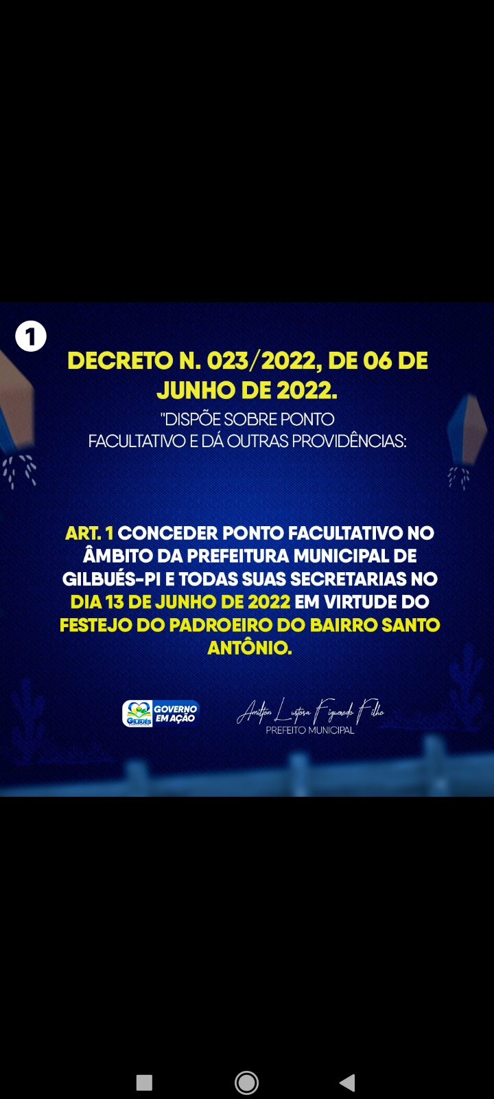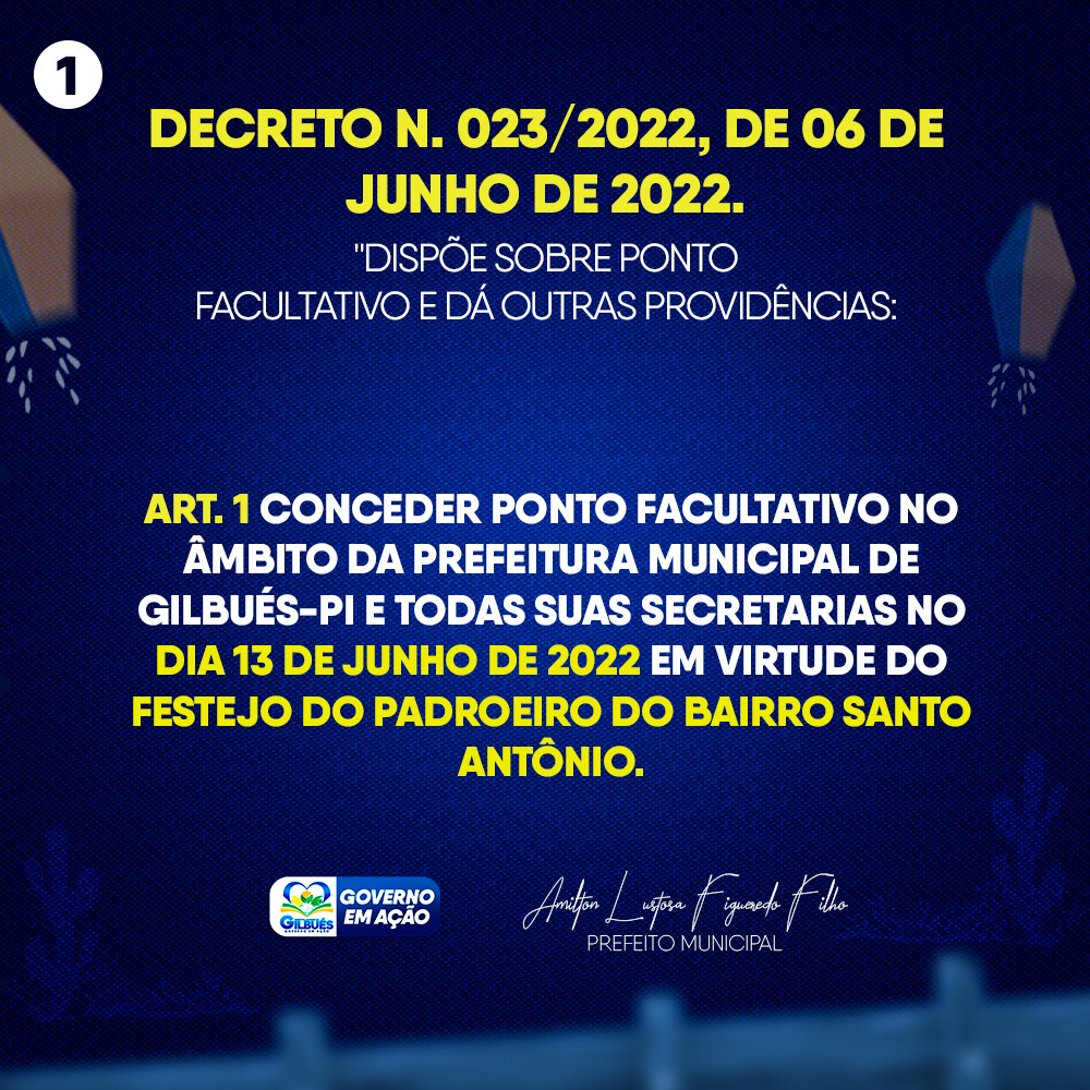 Data: 09/06/2022A prefeitura Municipal de Gilbués decretou ponto facultativo na próxima segunda-feira (13) em virtude do festejo do padroeiro do bairro Santo Antônio no âmbito da prefeitura e todas suas secretarias.