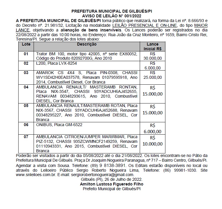 Poderão ser visitados a partir do dia 05/08/2022 até o dia 21/08/2022. Os lotes encontram-se no Pátio da Prefeitura Municipal De Gilbués. Praça Dr Joaquim Nogueira Paranagua, nº 717 – Bairro Centro, Gilbués/Pi. Agendar a visita com Sousa. Telefone: (89) 9 8138-3891. Os Editais estarão disponíveis no local ou através do Leiloeiro Público Sergio Roberto Nogueira Lima, Telefone: (86) 99981-1030. Site www.snleiloes.com.br. E-mail: sergiorobertonogueira@gmail.com.