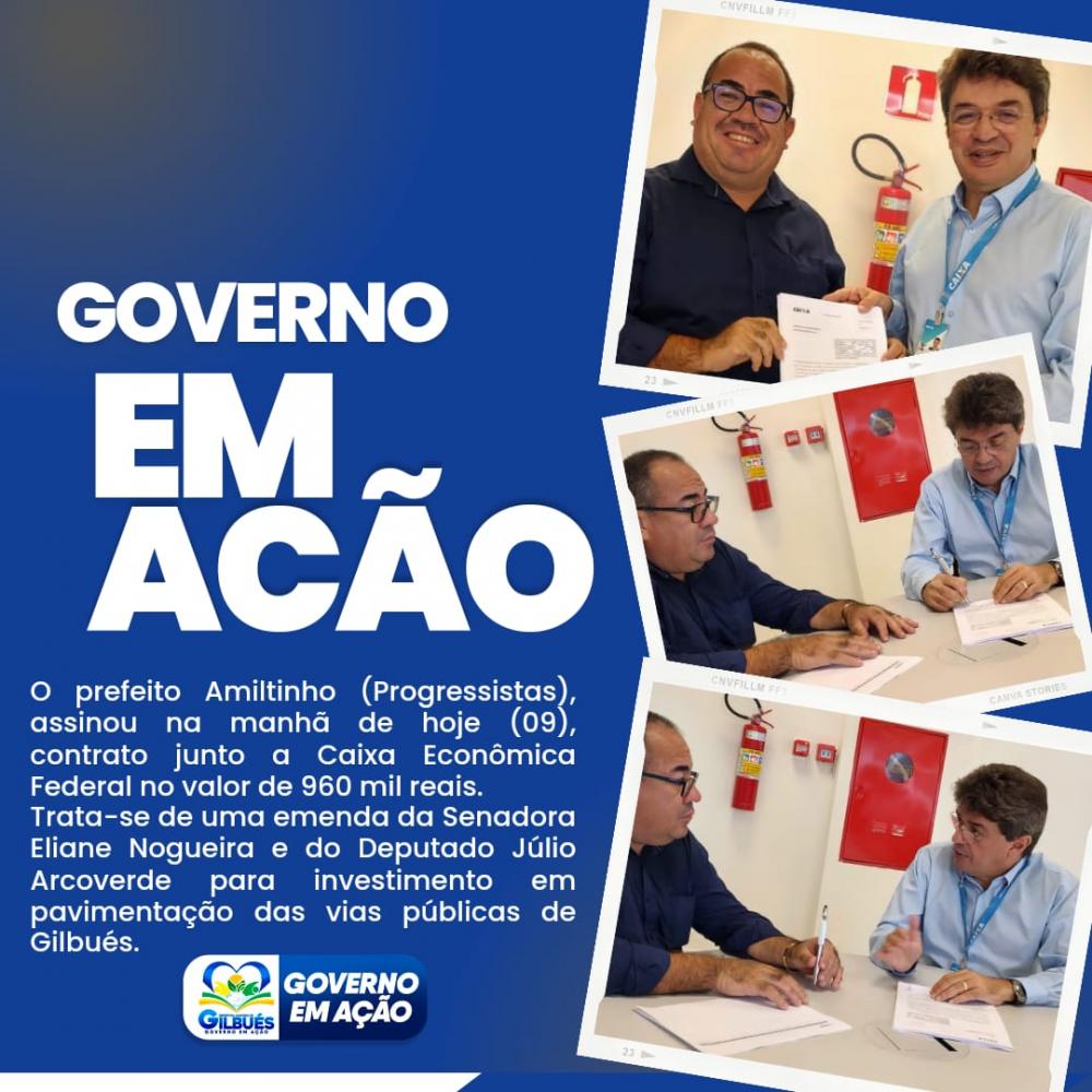 Data: 10/11/2022O prefeito Amiltinho, de Gilbués, assinou na manhã desta quarta-feira (09) um contrato junto a Caixa Econômica Federal no valor de R$ 960 mil reais que serão investidos no município.