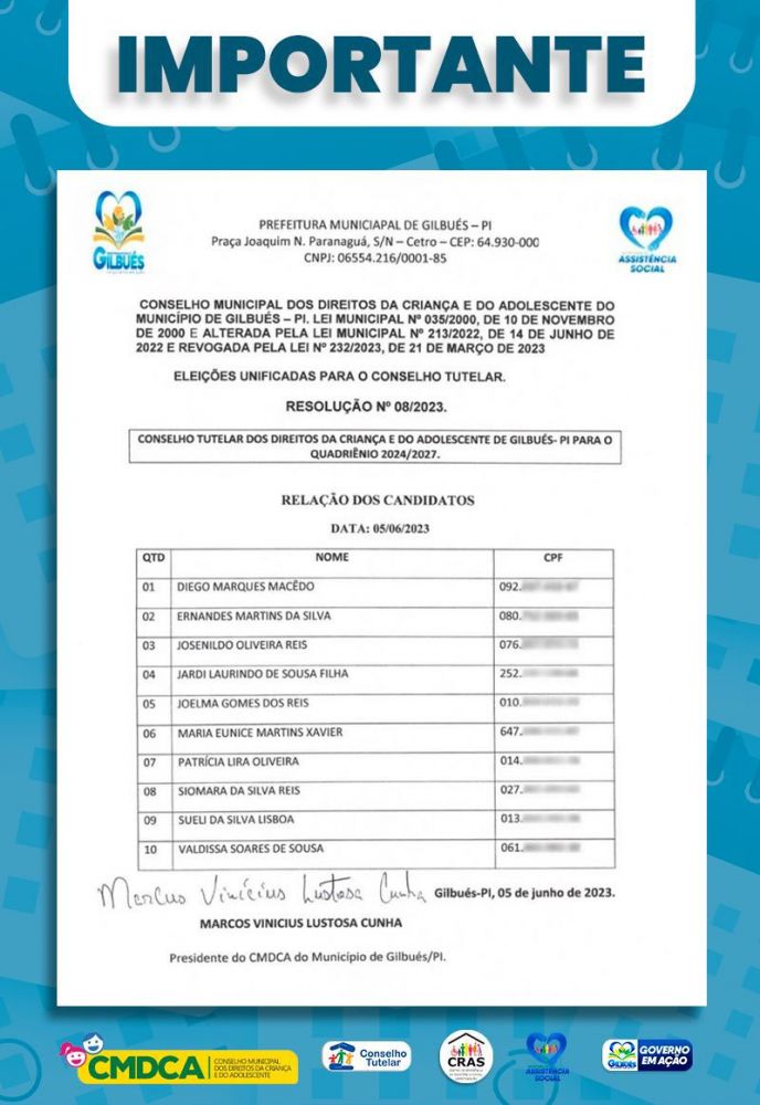Data: 14/06/2023O Conselho Municipal dos Direitos Da Criança e do Adolescente de Gilbués, por meio da Comissão Especial, no uso das atribuições legais, divulgou a relação nominal dos candidatos inscritos no Processo de Escolha dos membros do Conselho Tutelar do município.