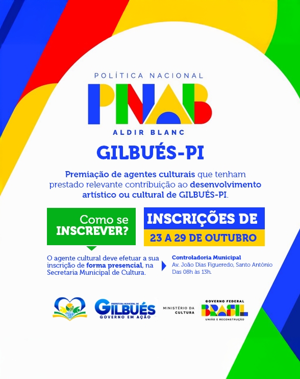 As inscrições para a Política Nacional Aldir Blanc (PNAB) se iniciará nessa quarta-feira! Participe de 23 a 29 de outubro. As inscrições podem ser realizadas de forma presencial na Secretaria Municipal de Cultura (Controladoria). Não perca essa oportunidade de fortalecer a cultura local! #CulturaGilbués #PNAB #AldirBlanc