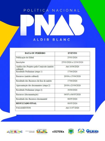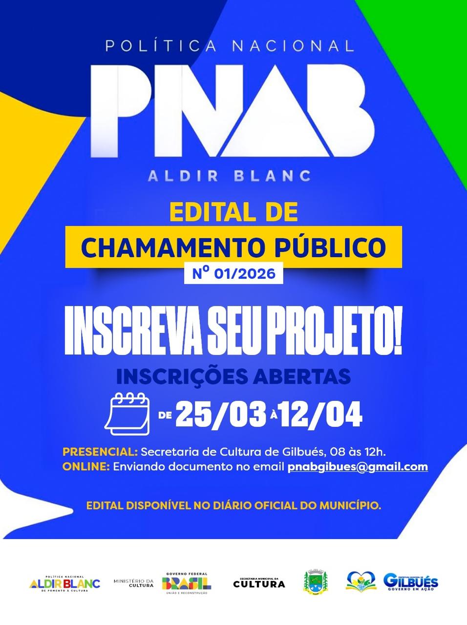 A Prefeitura de Gilbués, por meio da Secretaria Municipal de Cultura, informa que estão abertas as inscrições para o Edital de Chamamento Público nº 01/2026 da Política Nacional Aldir Blanc (PNAB).